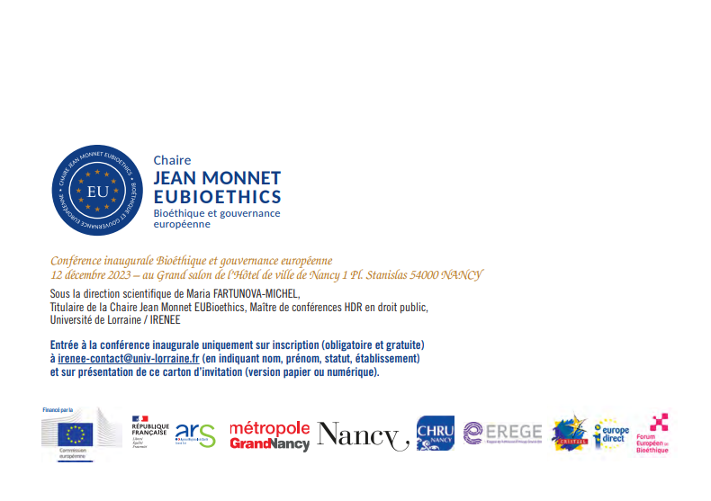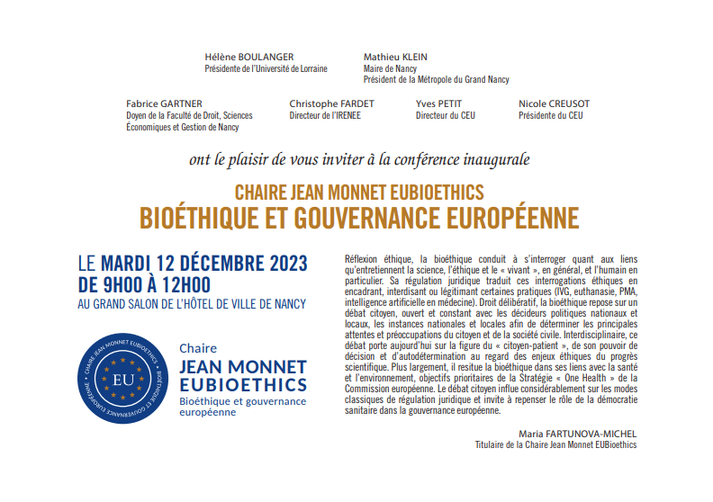 La conférence inaugurale de la Chaire Jean Monnet EUBIOETHICS, bioéthique et gouvernance européenne, portée par Maria Fartunova-Michel, aura lieu au Grand salon de l’Hôtel de Ville de Nancy le mardi 12 décembre 2023.