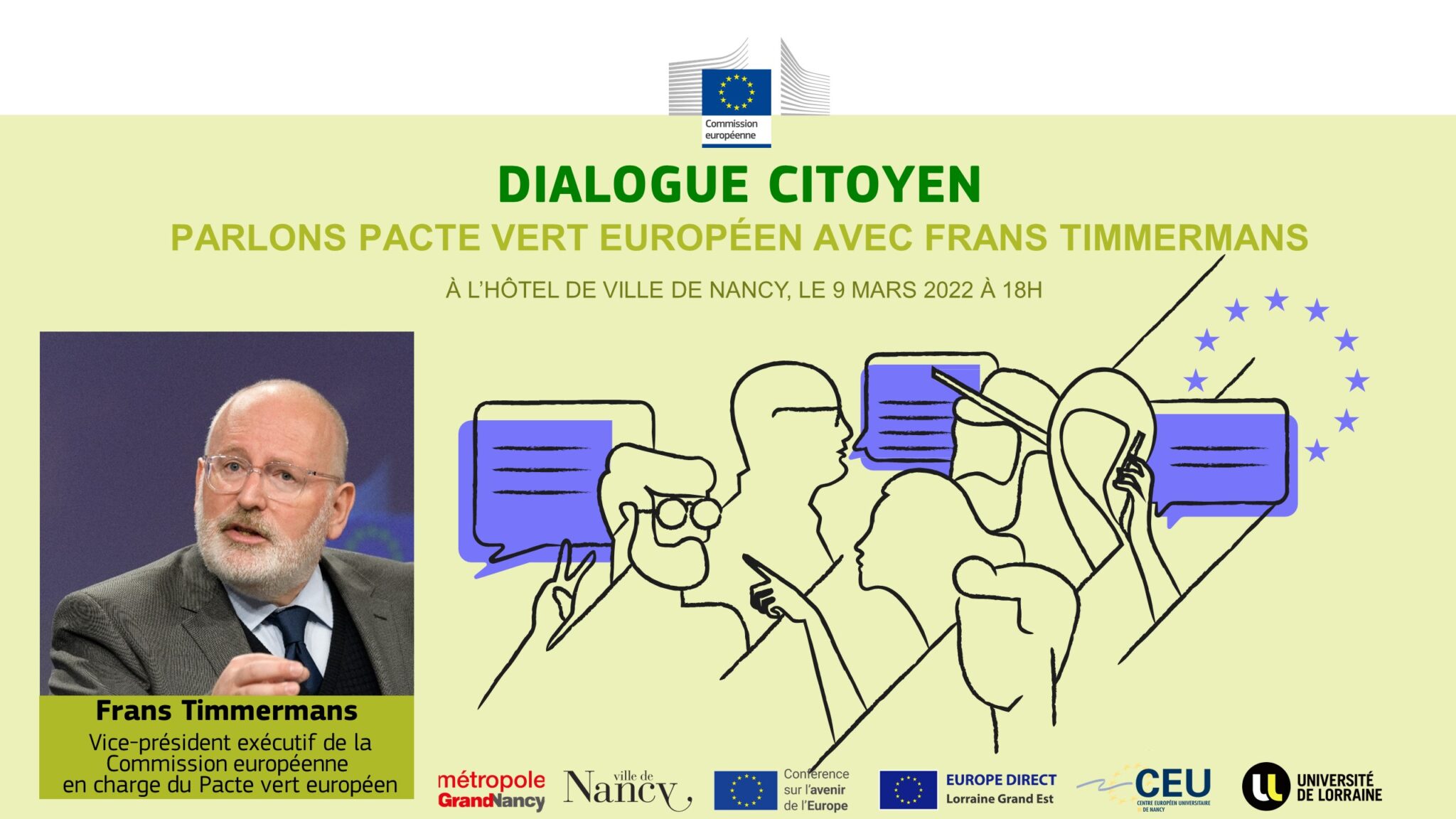Suivez en direct le débat sur le Pacte vert avec Frans Timmermans, les étudiants du CEU, la jeunesse et les citoyens nancéiens.