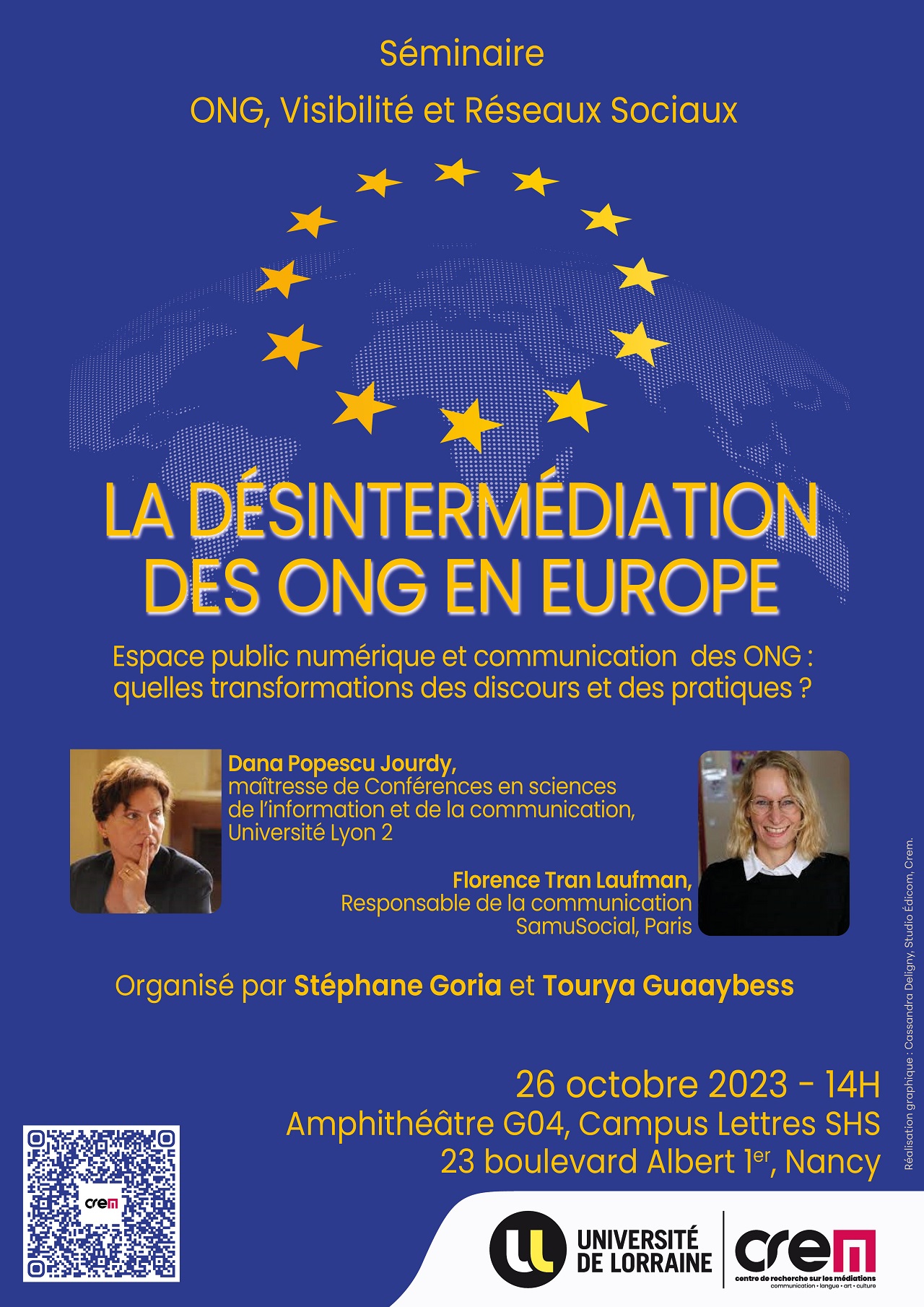 Tourya Guaaybess, Head of the “International Public Relations” program at CEU and researcher at CREM, invites you to a conference on the theme of “The Disintermediation of NGOs in Europe” on Thursday, October 26, at 2:00 PM at the Letters and Humanities campus (Amphitheater K03).