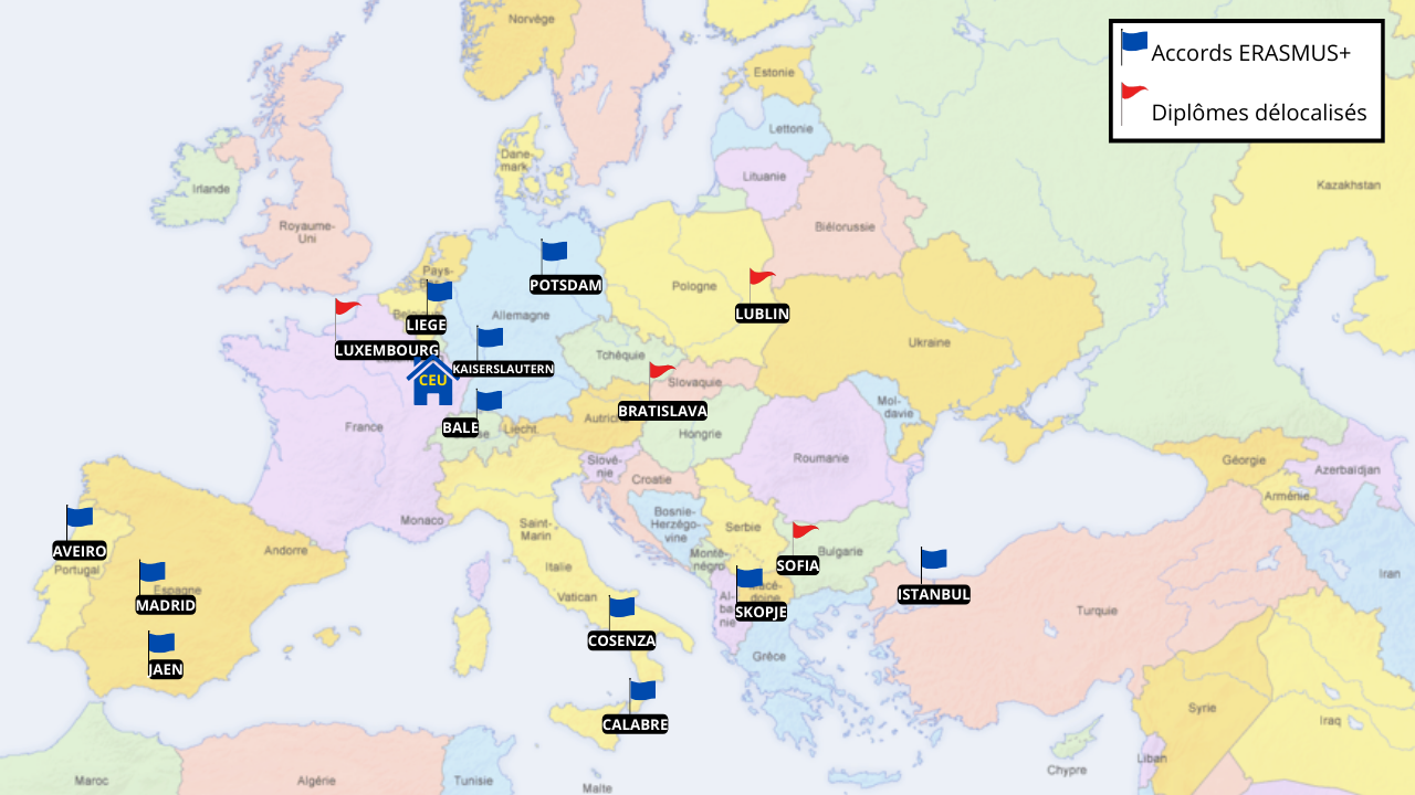 Le Centre Européen entretient des relations dans le cadre du programme ERASMUS+ avec une dizaine d’Universités européennes en particulier dans les Pays d’Europe Centrale et Orientale, dans les pays nordiques ainsi qu’en Turquie. Dans ce cadre, il accueille chaque année pour un ou deux semestres une vingtaine d’étudiants ERASMUS. Il en envoie quelques-uns aussi, en mobilité sortante, au premier semestre du master 1ère année ou en stage en 2ème année.