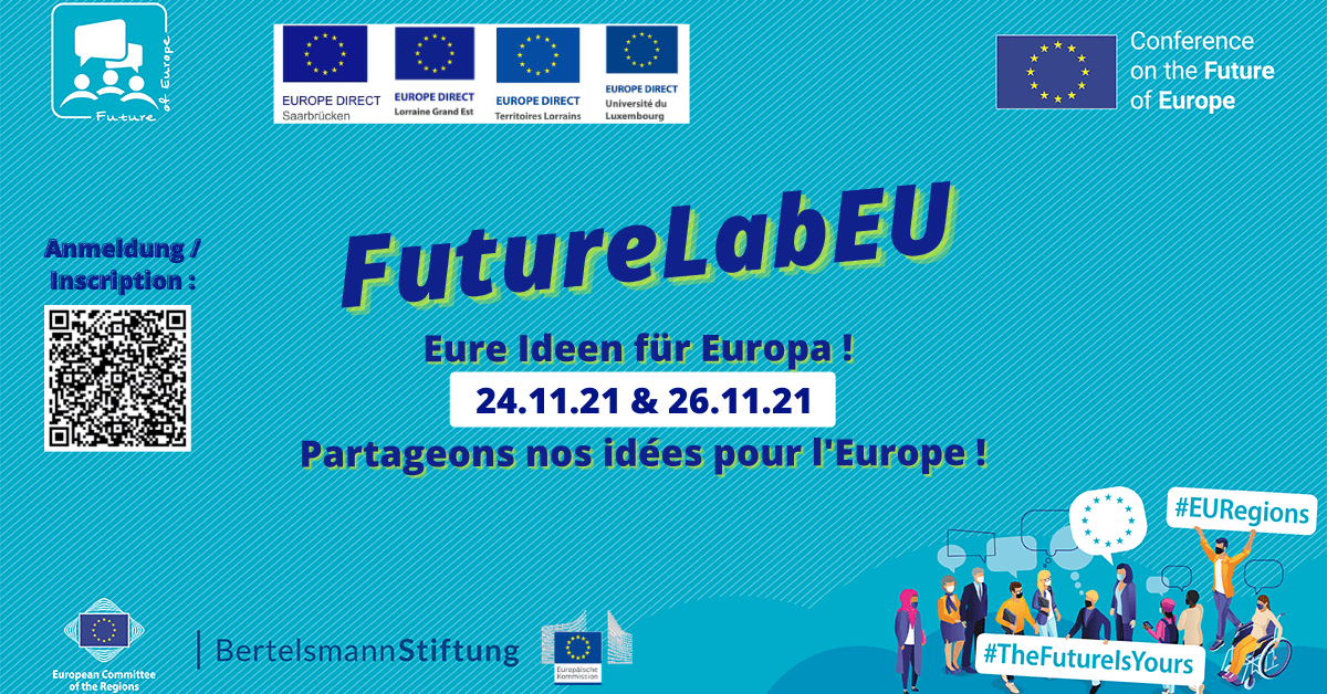 Dans le cadre de la Conférence sur l’avenir de l’Europe lancée par les institutions européennes, les centres EUROPE DIRECT Territoires Lorrains, Lorraine Grand Est, Sarrebruck et Université du Luxembourg invitent les jeunes de la Grande Région à participer à un dialogue citoyen trinational et digital les 24 et 26 novembre 2021.