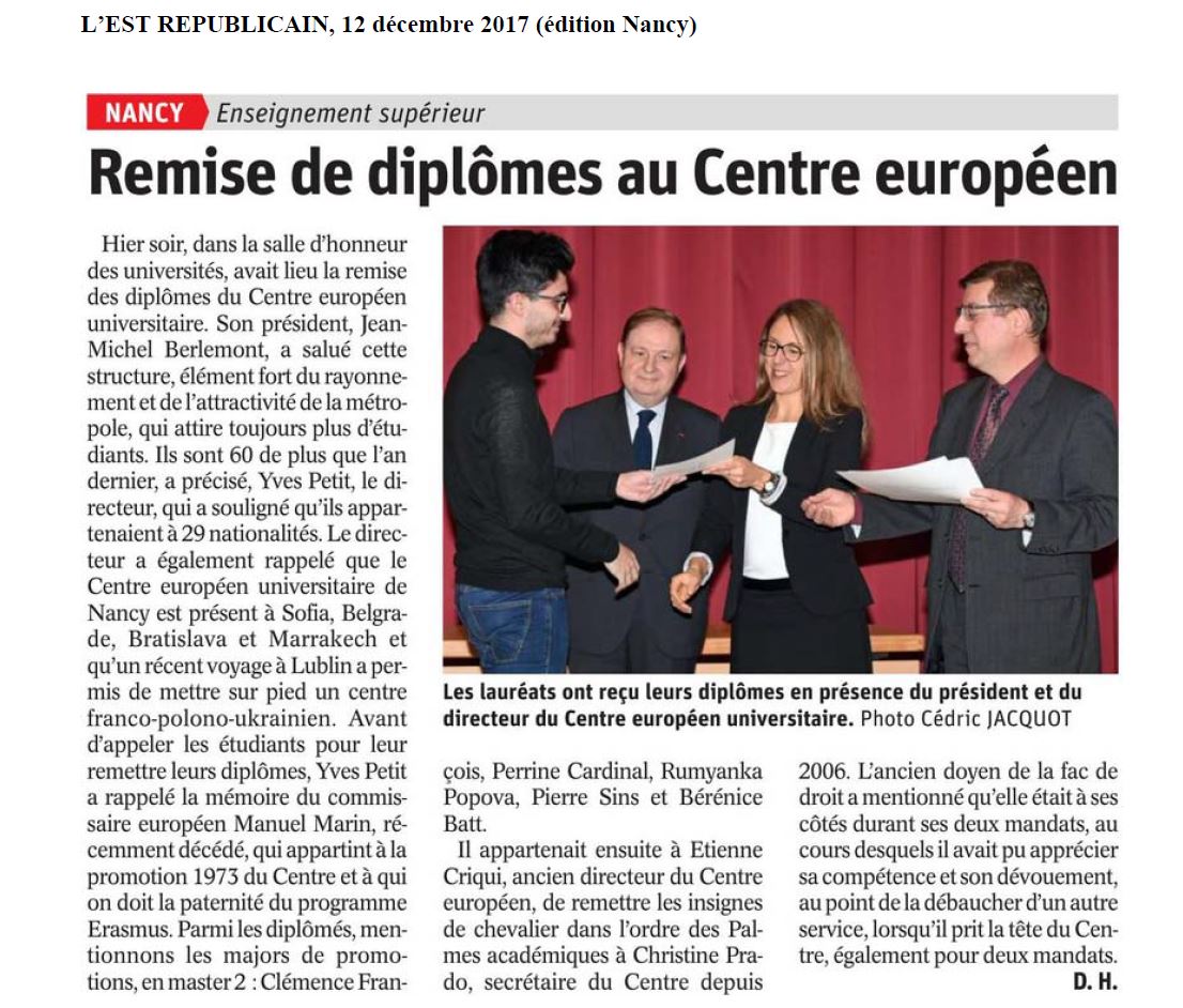 « Remise de diplômes au Centre européen » dans l’Est Républicain
