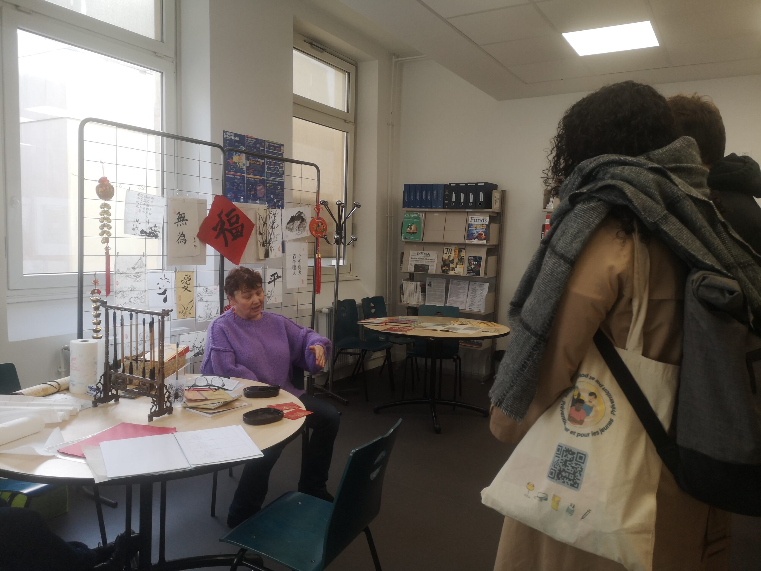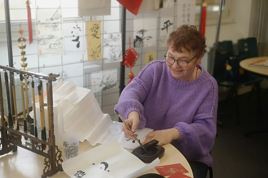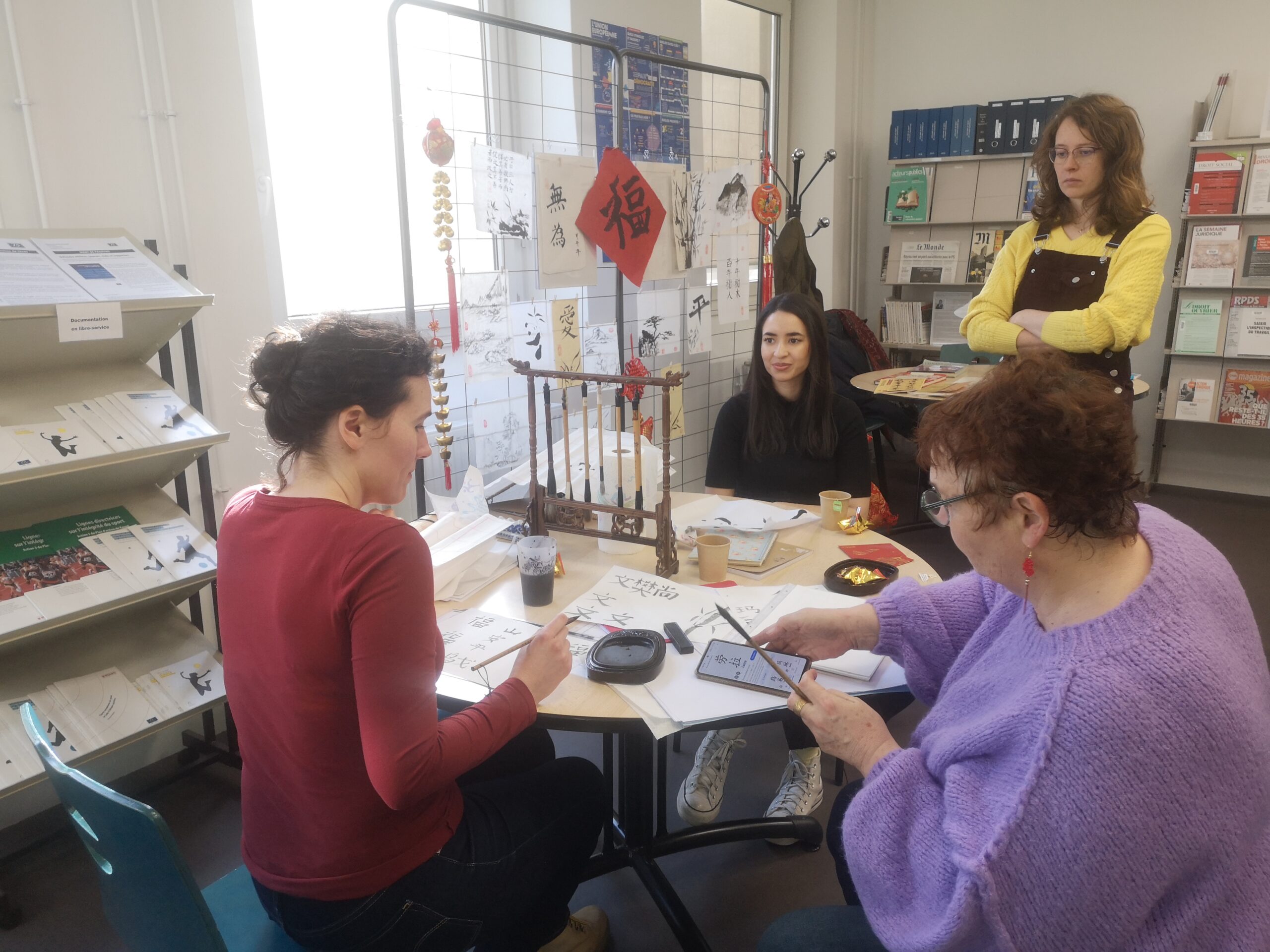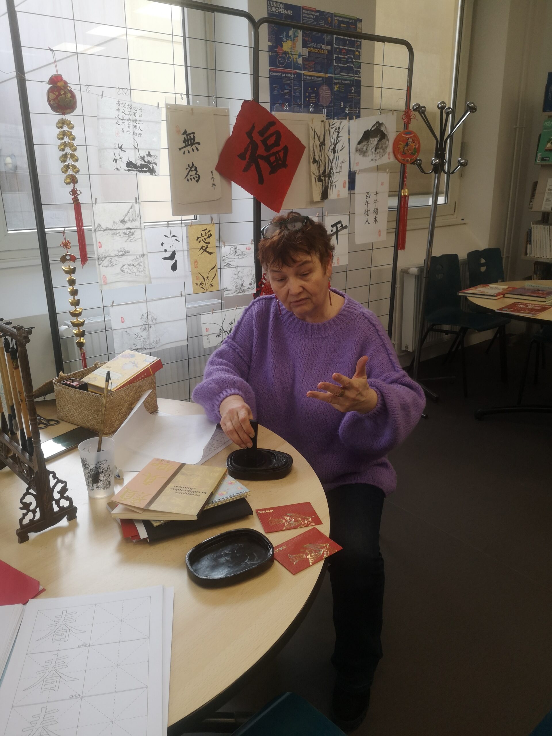 Nous avons ensuite pu découvrir ses travaux de calligraphie et assister à une démonstration du maniement du pinceau et de l’encre de Chine avant de nous essayer personnellement à l’art de la calligraphie.
